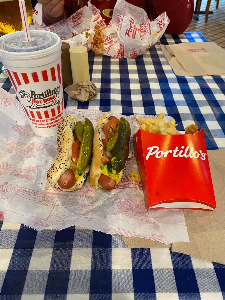 We ate great local food! Forgive us both, Chicago diehards, but as much as we like deep dish pizza, it doesn’t like either of us back, so we elected for other local fare. We walked to a legendary Chicago chain, Portillo’s, for local red hots. I’m a ketchup guy but I eschewed my preferred style to eat like the locals, with pretty much every other condiment and a pickle spear to match. Perhaps weird, but still tasty.