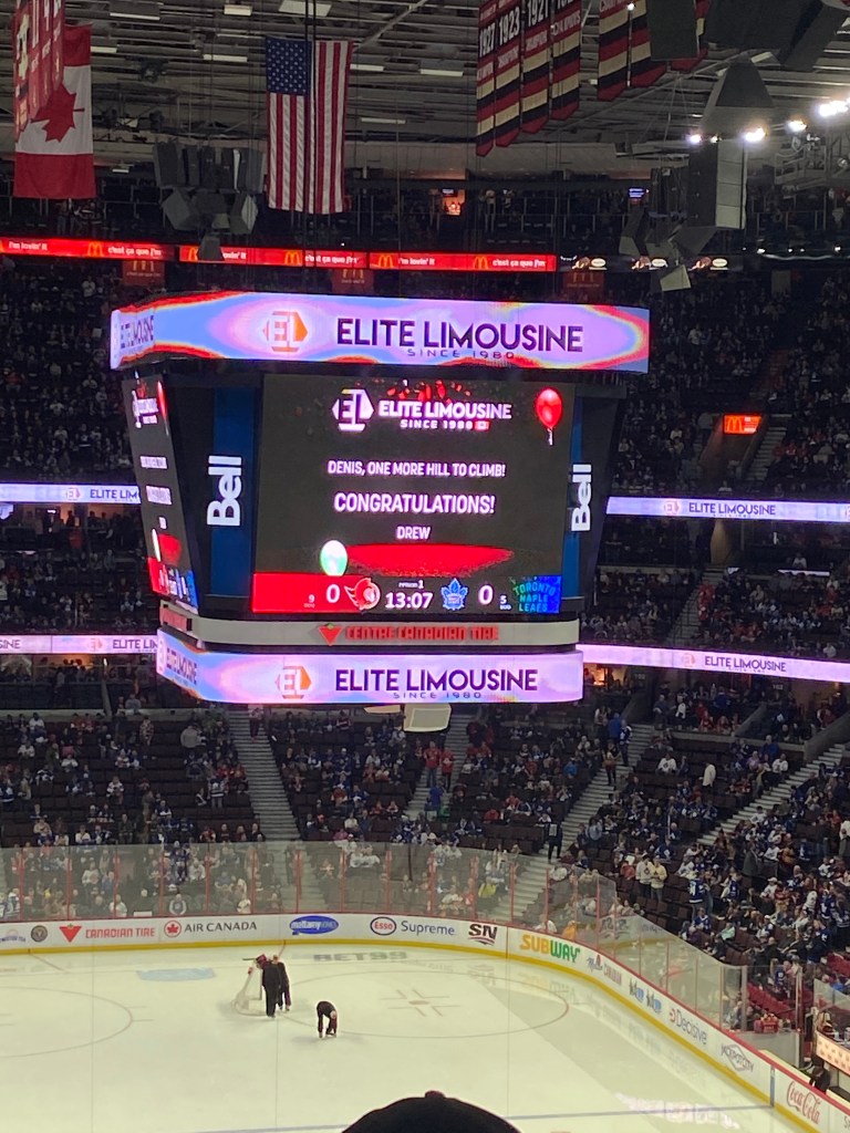 A simple gesture, but Drew got a message up on the jumbotron at center ice stating, “Denis, one more hill to climb, congratulations!” A true Rangers fan salute, indeed! “One more hill to climb” was the call from Rangers radio announcer Howie Rose in 1994, when Stephane Matteau won the Eastern Conference Finals with a double-overtime goal. The Rangers indeed climbed that hill (“Mount Vancouver”, as Rose called it), defeating the Vancouver Canucks in the 1994 Stanley Cup Finals. My hill to climb won’t involve the Stanley Cup, but it will be special nonetheless.