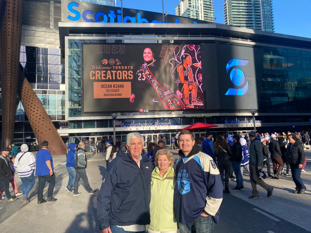 And after enjoying a final pregame meal a few blocks from the arena at Hunter’s Landing, Mike, Drew, Mom, Dad, and I geared up for the final few blocks of the journey on Bremmer Boulevard in downtown Toronto. Which, fittingly, dead-ended into Maple Leaf Square and the front door of Scotiabank Arena.