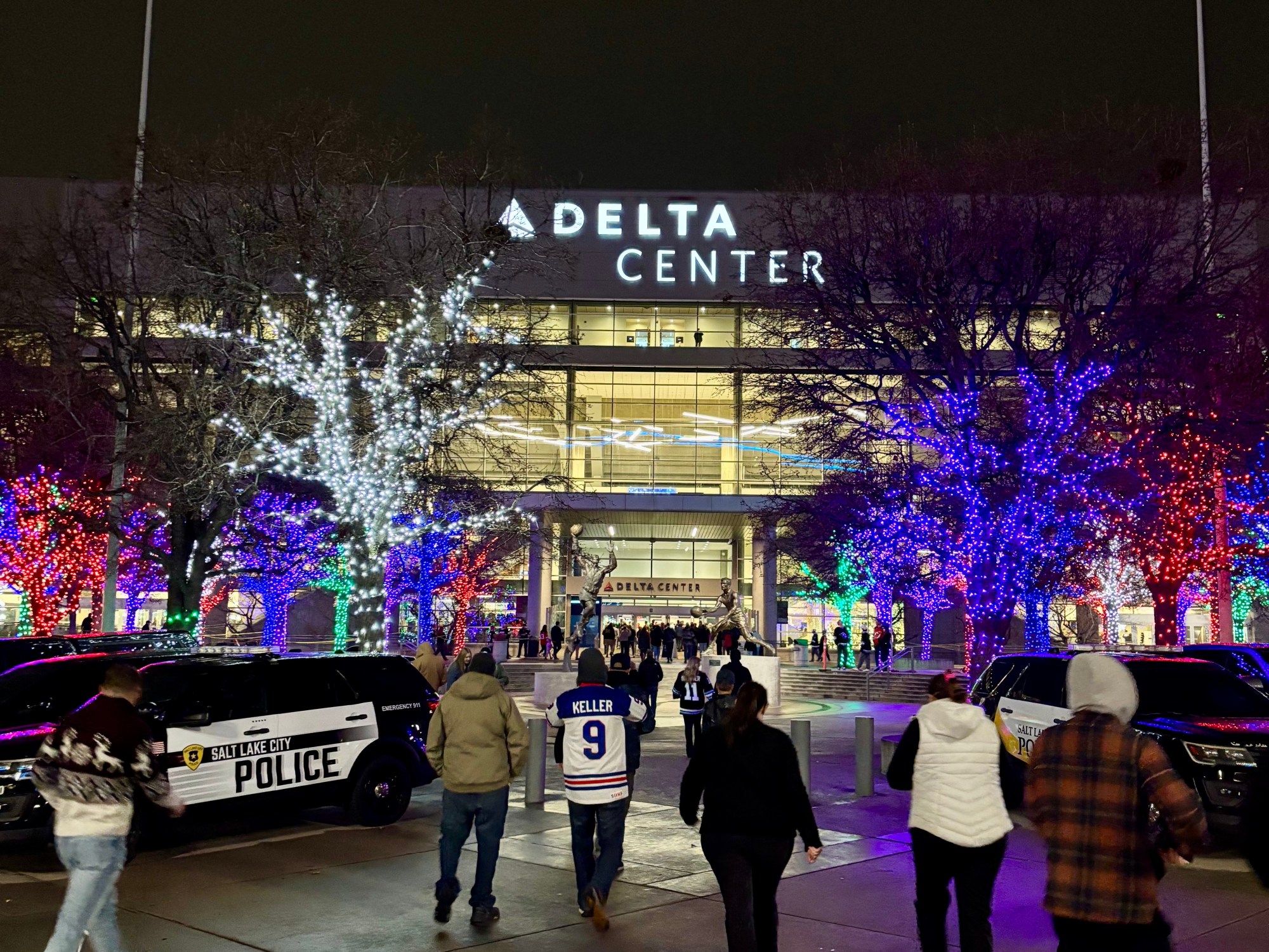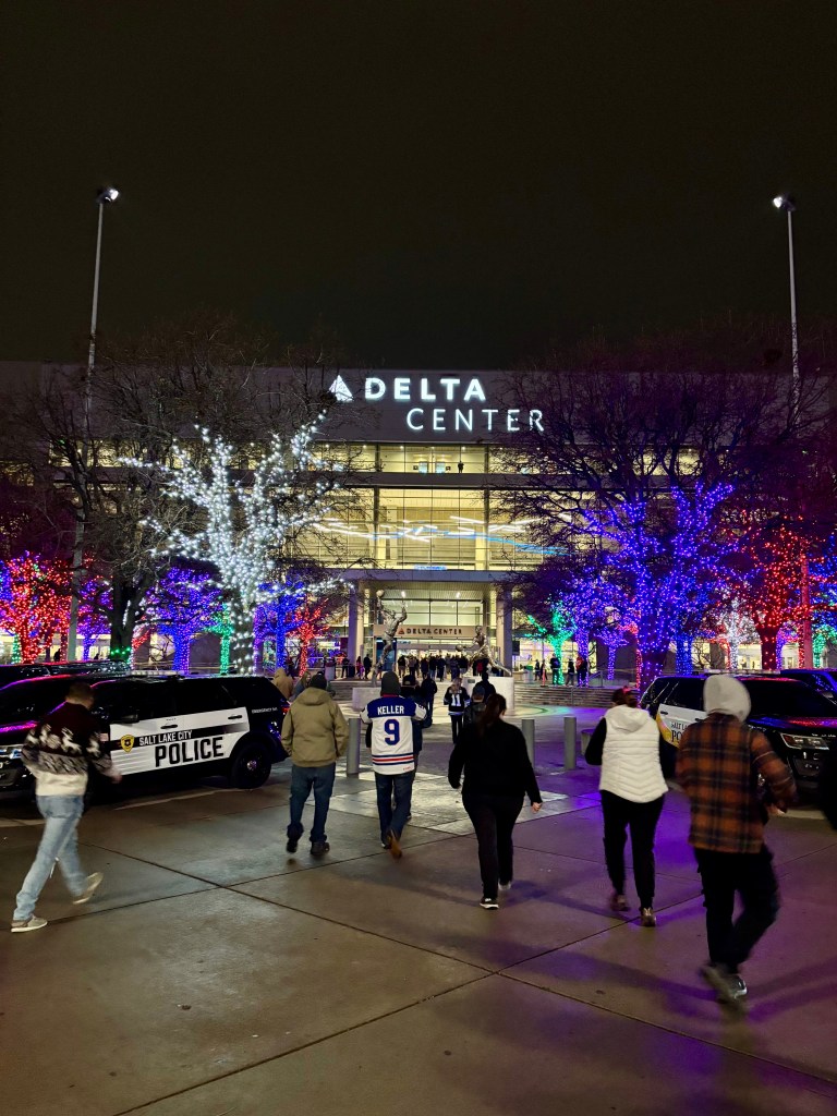 Of course, we also had our “healthy critiquing” of the arena. I won’t bore you with the details; Delta Center is just fine. Not great, not terrible, just fine. A bit small for an NHL building, but it was constructed for the NBA’s Utah Jazz and not for a hockey team, so that tracks. There was nothing “bad” about the arena, per se, but it also lacked any kind of character or color or charm. Concourses were bland with white walls and black floors, and the interior lacked pizzazz. The holiday lights in the trees outside the arena were a nice, festive touch though!